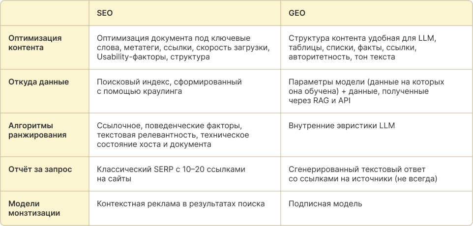На первый взгляд GEO напоминает SEO. Но если присмотреться — отличий много: в принципах ранжирования, в формате выдачи, в подходах к сбору и интерпретации данных. В таблице ниже мы сравниваем два подхода — по ключевым параметрам.