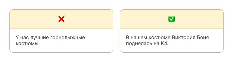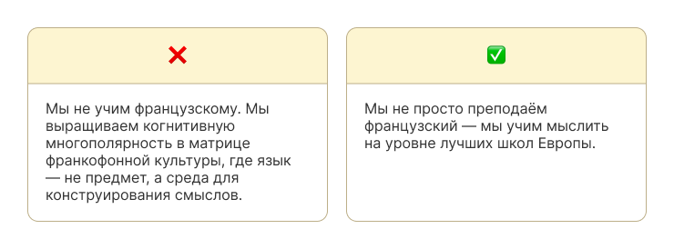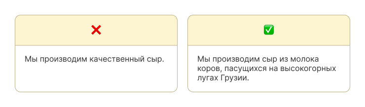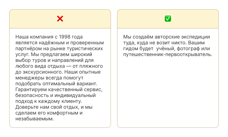 ❌ «Мы лучшие», «индивидуальный подход», «высокое качество», «инновационные решения».