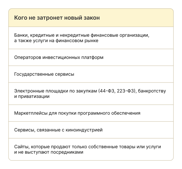 Если коротко, закон касается цифровых платформ, через которые продают товары и услуги. То есть тех площадок, где проходит не только размещение информации, но и сама сделка — с оплатой через сервис. Сайт, который просто публикует объявления и не участвует в расчётах, под действие закона не подпадает.