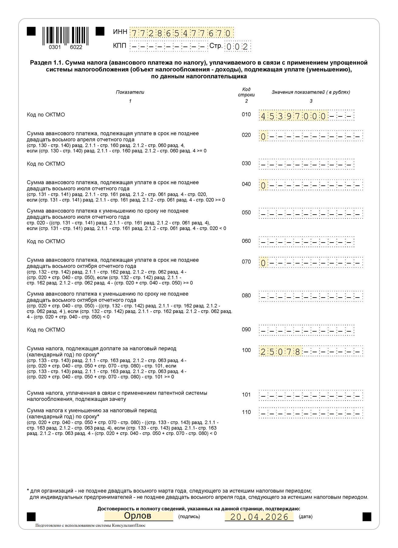 Раздел 1.1. Здесь информация о том, где и сколько налогов вы должны заплатить. Первая строка — это код по ОКТМО, общероссийскому классификатору территорий. Это код той территории, где вы будете платить налог за год, и где были уплачены авансовые платежи. Узнайте его на сайте «Росстата» или ФНС.