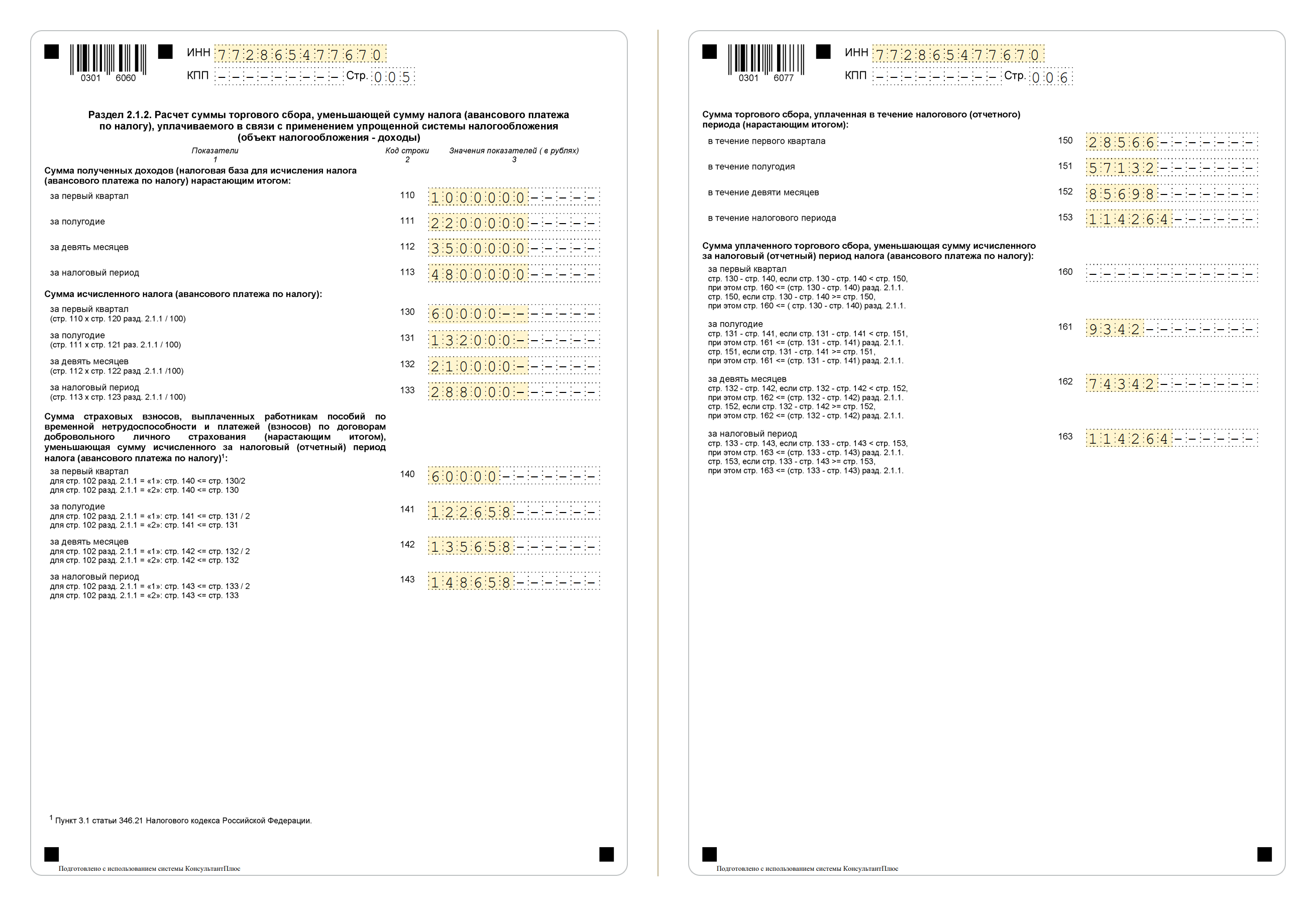 - Раздел 2.1.2 — те, кто платит торговый сбор в Москве. Сюда вносят уплаченные суммы торгового сбора. Размер зависит от торговой площади и места расположения бизнеса.