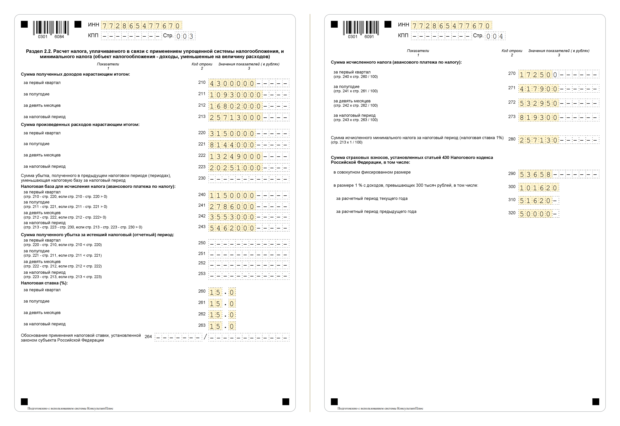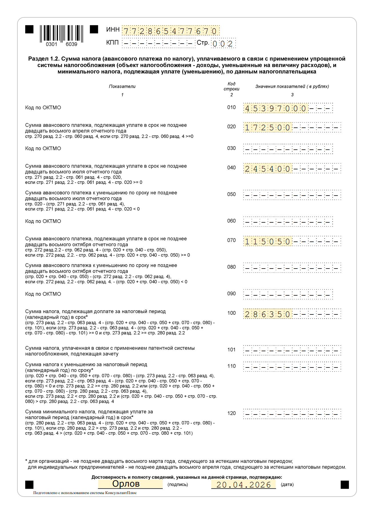 Если работаете по УСН «Доходы минус расходы», тоже заполните титульник. В разделе 1.2 заполните строку 010 кодом ОКТМО. В разделе 2.2 в строках 260–263 укажите налоговую ставку. Обычно это 15%.