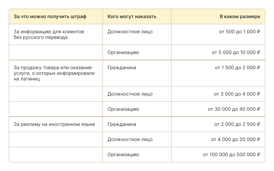 Несоблюдение закона о русском языке влечёт за собой административную ответственность. Размер штрафа напрямую зависит от двух факторов: