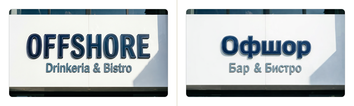 Отдельно закон регулирует всё, что идентифицирует бизнес или указывает на его работу. Сюда входят вывески и световые короба с названием, указатели направления, таблички на дверях, график и контактные данные. Эти элементы тоже должны быть на русском языке, так как их главная функция — информировать клиентов.